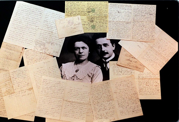 “Einstein Family Correspondence, including Albert Einstein-Mileva Marie[sic] love letters, surround a portrait of the couple, before going under the hammer at Christie’s in New York on November 25, 1996.” 1996. David Cheskin. PA Images/Getty Images. https://www.gettyimages.com/detail/news-photo/einstein-family-correspondence-including-albert-einstein-news-photo/829881250. Used under License.